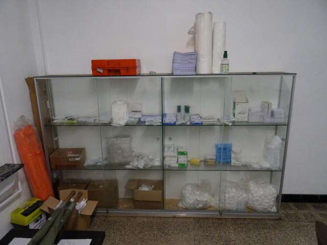 oa. bed, draagbed, glazen kast, toebehoren EHBO, bureautafel, stoelen (alles moet mee)