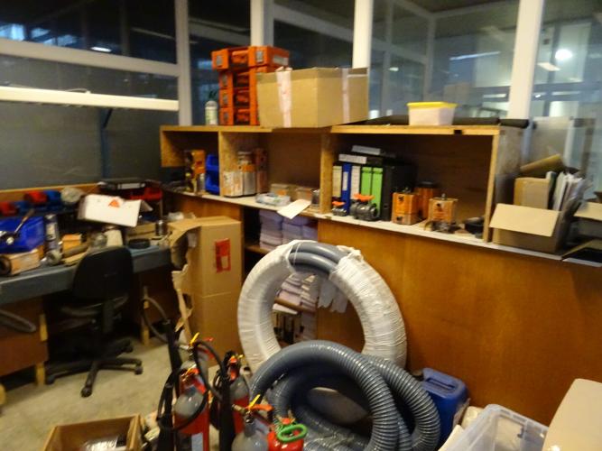 metalen kasten, metalen bureaus, computer, brandblussers, klein materiaal, metalen rek, printer, ... (alles moet mee)