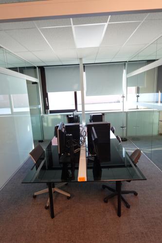 Bureautafel 3370x1570x780 mm met glazen blad en alu onderstel, 3x bureaustoel, 2x stoel, 4x PC met scherm, kapstok, metalen bureau 1500x800x780 mm, bureaustoel + stoel, PC scherm, +++ alles moet mee