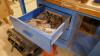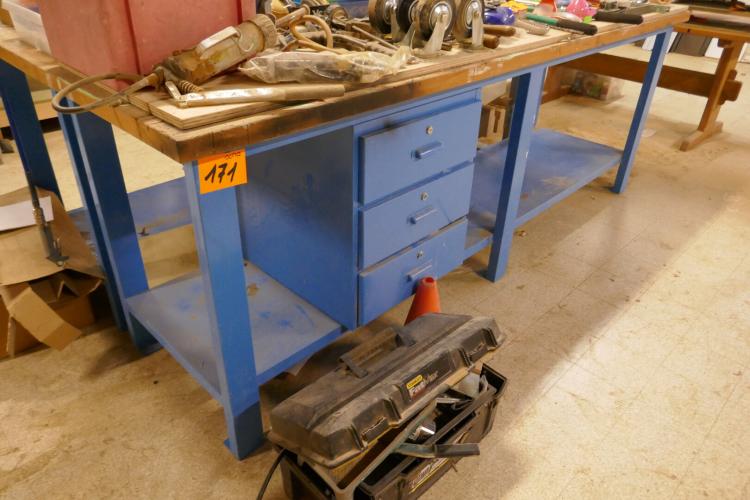 Blauwmetalen werkbank met 3 schuifladen en bodemschap
