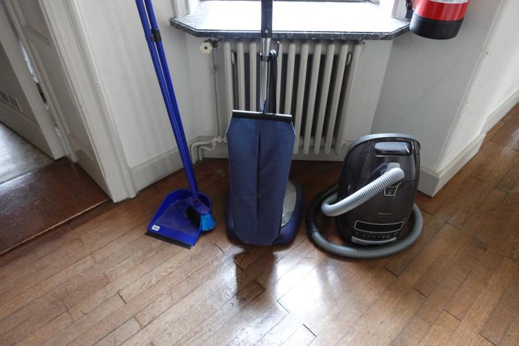 alles van het 1e verdiep, oa: diverse tafels, stoelen, electonica, metalen kasten, kunst,... (de zetel op het 2de verdiep)