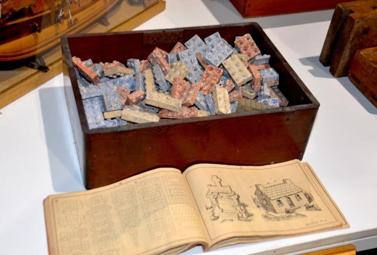 Belgische voorloper van Lego. Geproduceerd door Belgische speelgoedfabrikant Nazaire Beeusaert te Deinze. Ca. 1954. Incl. handleiding.