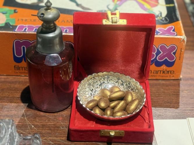 Antiek parfumflesje en schaaltje in rood fluwelen doos