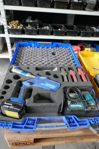 *Koffer, batterij en batterijlader MAKITA en 3 persbekken