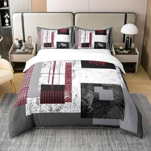 Ongeopend, in seal, Homewish Katoenen dekbedovertrek, 220 x 240 cm, vierkant, geometrisch, rood, zwart, wit, grijs, voor meisjes en jongens, 2-persoonsbedovertrek, modern esthetisch beddengoed, zacht beddengoed, B0D31GRP6Z