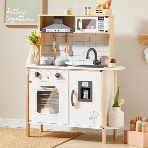 Ongeopend, in seal, Tiny Land Kinderkeuken met 18 speelgoedartikelen, etenswaren en kookgerei. Houten speelset voor peuters, waarin ze als chef-kok kunnen spelen, met realistische licht- en geluidseffecten, B08SPY6SRG