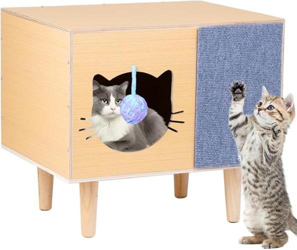 Ongeopend, in seal, Houten kattenhuisje, binnenverblijf voor katten met bel, krabmat en kattenkussen, kattenkastje voor hal en slaapkamer, eenvoudig te monteren, 50 x 40 x 32 cm, B0DRCRPCP9