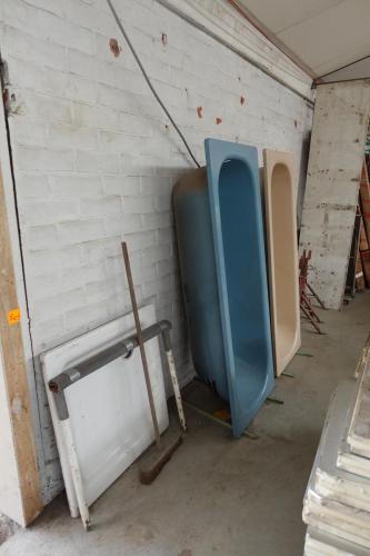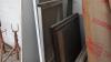 alles die tegen wand staat, oa: 2x bad, steunen, vliegenramen, kadermenten,...