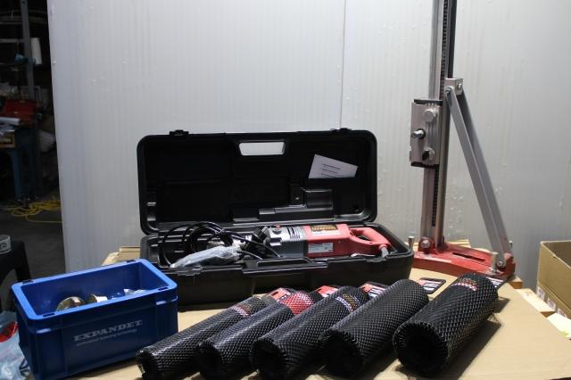 Ongebruikt, halsaansluiting motorbevestiging en hendel ontbreken, Droogboorpakket, Interdiamant diamantboormachine ID2200 (2000W, 1/25/4), boorstatief D200, droogboor oscillator diameter 71/81/91/101/111 x 300, verankeringsset