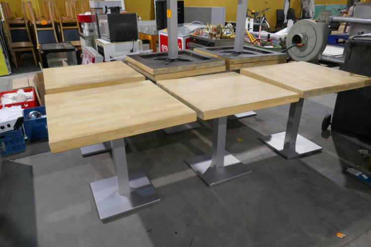 8 horecatafels op metalen voet en houten bovenblad - afmeting : 80x80 cm
