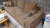 Bruinstoffen 3-zit zetel + houten salontafel + 2 clubzetels -+ bijzettafel + zitpoef + huisdiertapijt en drinkkommen