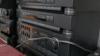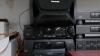 Vintage draagbare radio, stereo installatie, platendraaier, DVD speler en luidsprekers