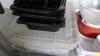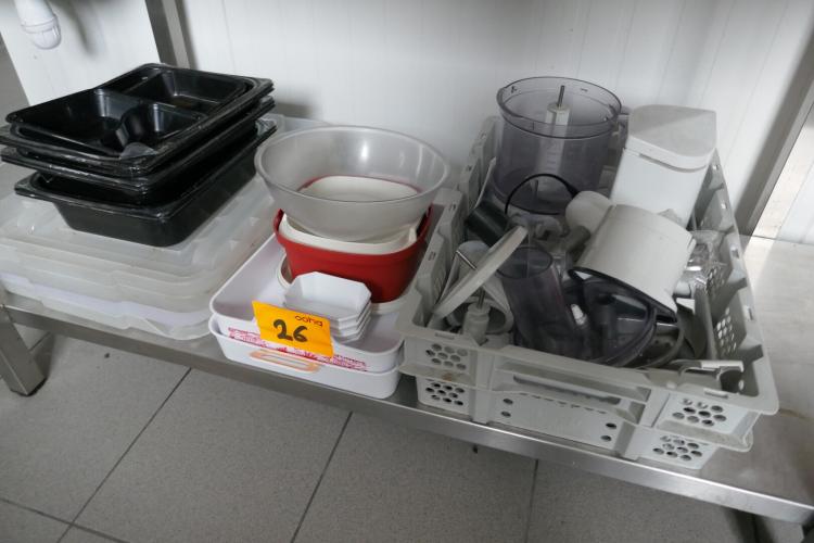 Blender in plastieken bak + plastieken manden, schalen en kommen