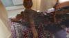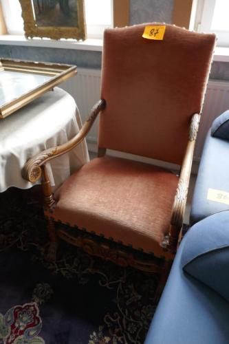 Antieken fauteuil met houten snijwerk en tapijtbekleding