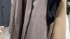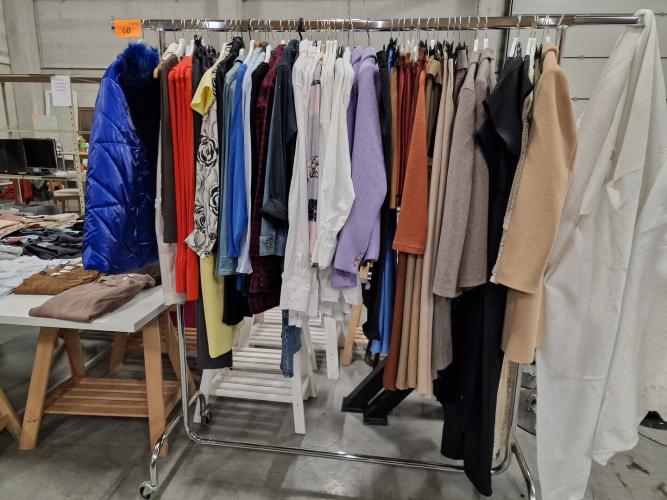verchroomd verrolbaar kapstokrek met een 55-tal kledingsstukken voor dames, waaronder : jassen, mantels, bloezen, kleedjes,…