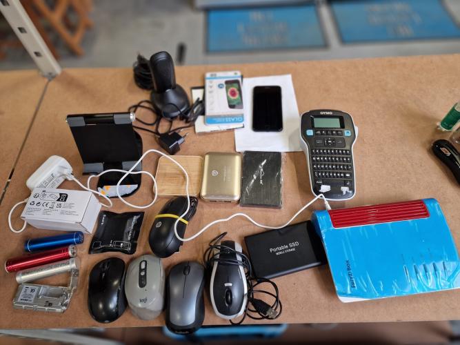diverse bureelbenodigdheden, waaronder : smartphone IPHONE, letterzettoestel, merk DYMO, externe SSD, batterijen, muizen, draadloos telefoon,…