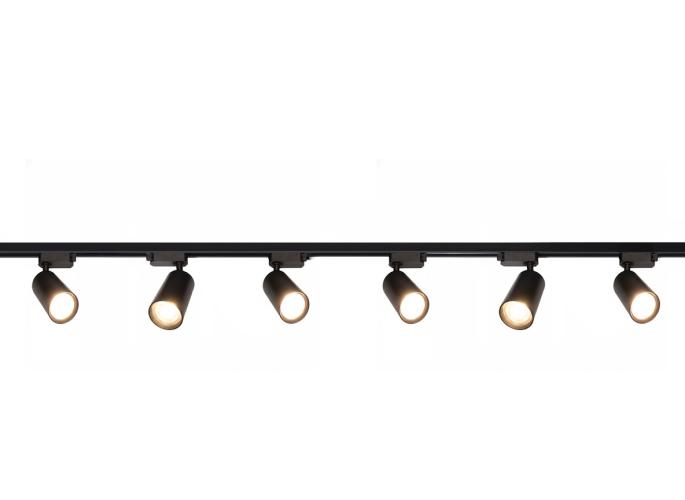 1 x 1 stuks 1 fase 2 draad 200cm rail - materiaal aluminium - bevestiging inclusief - 220-240V - afdichting IP20 - product kleur zand zwart of zand zwart - 6 stuk railspots GU10 armatuur afm. Ø 55 x 100mm draaibaar 350° en kantelbaar 90° - bulb niet inbegrepen - de rail kan eenvoudig op de gewenste lengte worden gezaagd - geschikt voor binnen - HRZ300 SKU 907