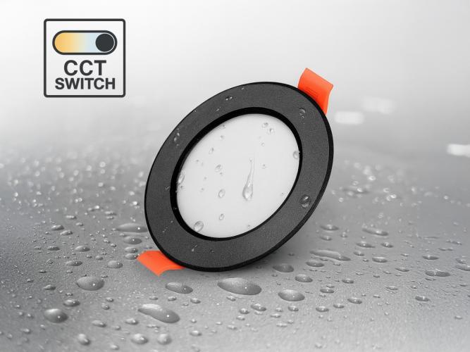 50 x 4.9 watt CCT 3 kleur Inbouw Spot watredicht - lichtstroom 425 lumen - afdichting IP54 - lichtkleur 3 in 1 CCT switch warm wit neutraal wit en daglicht dat de kleurtemperatuur kan geschakeld worden tussen 3000K 4000K 6000K - stralingshoek 110° - product kleur zwart - PS diffuser - vlamfertragend kunstof afm Ø 90 x 42 mm - inbouwdiameter ø 70mm - materiaal PC en kunstof - bevestigingsset niet inclusief - geschikt voor badkamer veranda balkon - levensduur 15.000 uren - voltage 220-240V - SKU 1162