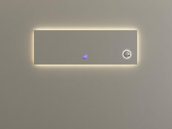 Voorzien van: Touch bediening via digitaal display – LED verlichting in 3 kleuren, dimbaar – Bluetooth & speakers – Digitale klok – Digitale temperatuurmeter – 220 volt aansluiting – Anti-fog technologie door verwarming in de spiegel – Vergrootglas (vergroot 3x) in de spiegel Ø10 cm - Kopervrije spiegel - 1,5mm explosieveilige laag aan de achterkant.
