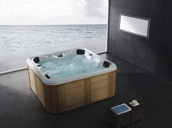 5 Persoons Outdoor Spa 208x208 cm - incl. 2 ligbedden - Wit bad / Naturel houten kleur zijkant
