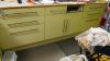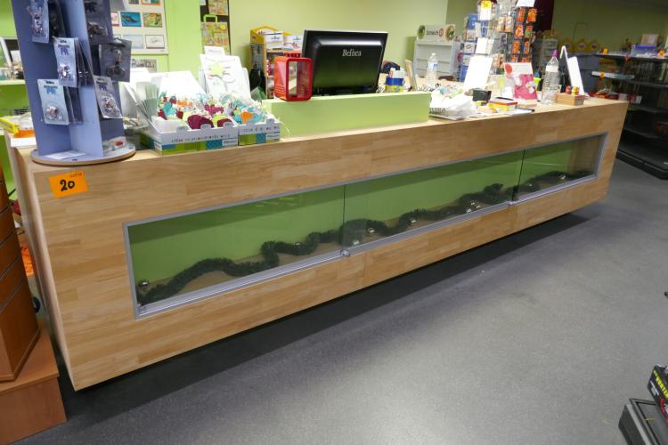 Compleet ingerichte houten toonbank in hoekmodel met vitrine, opbergruimte, laden en papierafrollers