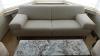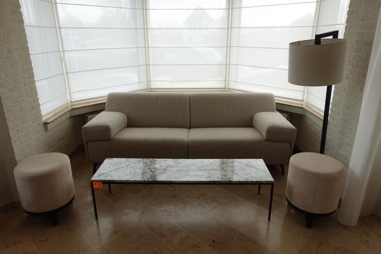Zitbank in stof 2300x900 samen met tafel met natuursteen blad 1500x400x390 2x poef & lamp