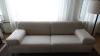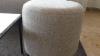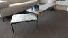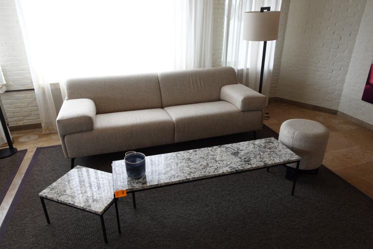 Zitbank in stof 2300x900 samen met tafel 1500x400x390 & bijzettafel met natuursteen blad & 1x poef