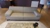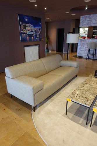 Zitbank in stof 2300x900 samen met tafel 1500x400x390 met natuursteen blad & lamp