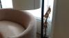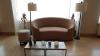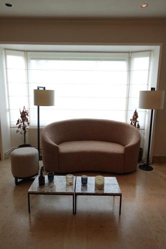 Zitbank in stof 2300x900 samen met 2x bijzettafel met natuursteen blad, 1x poef, 2x lamp, 2x bloempot
