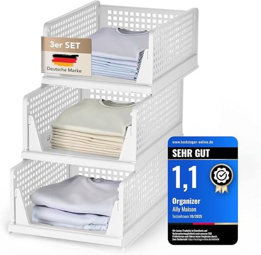 Ongebruikt, volledig, ok, Ally Maison Set van 3 stapelbare kast-/garderobe-/kastorganizers, 43 x 33 x 18 cm, ruimtebesparende, multifunctionele, opvouwbare lade-organizerbox voor opslag en organisatie, wit, B0FDKKKGJY