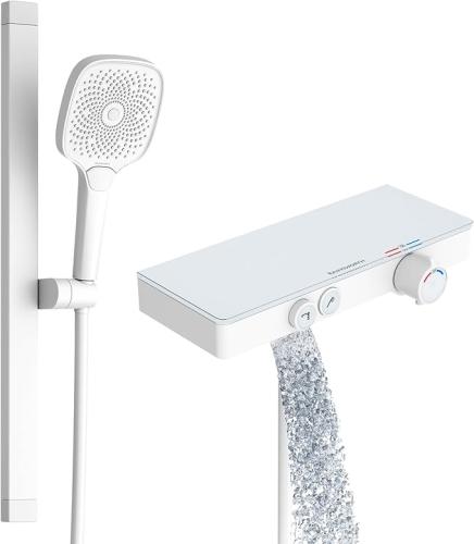 Minieme gebruikssporen, Vijzen en pluggen ontbreken, Rainsworth Douchekraan met thermostaatset, thermostaatsproeier en glazen plank, 3 straalsoorten, handdouche, 600 mm aluminium douchestang, doucheset, wit, B0CJBFQLRW