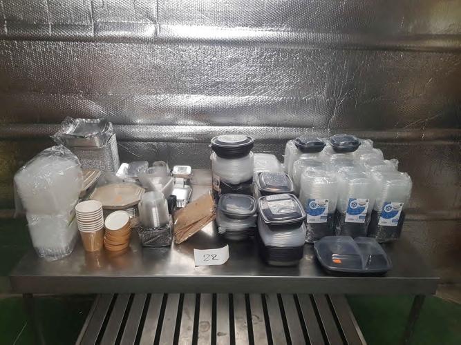 Assortiment voedselverpakkingen van kunststof, aluminium en karton voor desserts, hoofdgerechten en soepen, meer dan 500 artikelen en houten bestek