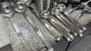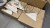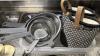 snijplanken, gastronormbakken, messenhouder, messen, pollepels, spatels, en dergelijk keukengerief + doos met o.a. frietzakhouders + kartonnen puntzakken + verlekbak + frietzeef