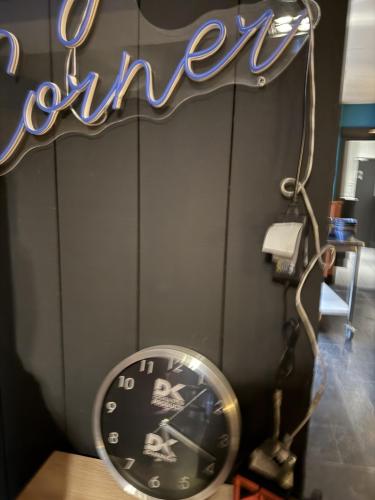 neon COSY CORNER + vloerlamp + lichtreclame OMER + wanduurwerk