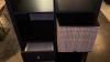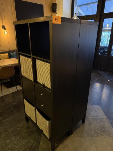 2 zwarte opbergkastjes met opbergmanden en schuiven