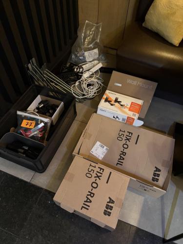 divers installatiemateriaal, gaande van wall-mount-systemen, wielen, haken, fix-o-rail ABB, kabel, tafelpoten, etc.