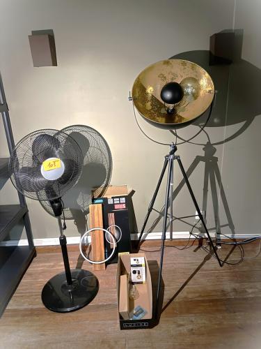 industriële vloerlamp op driepoot + ventilator op voet + LED - lamp + enkele losse lampen