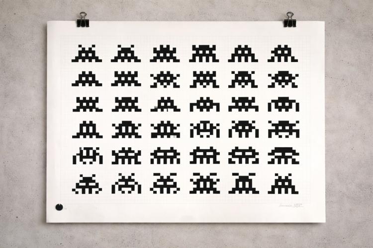 "Repitition, Variation, Evolution" by INVADER (2017) - Print op Arches-papier - Gesigneerd met potlood in de rechteronderhoek. - Genummerd, 150 exemplaren - Invader (geboren in 1969) is een pseudoniem van een invloedrijke, anonieme Franse straatkunstenaar die wereldwijd bekend staat om zijn mozaïekwerken gebaseerd op de pixels van het arcadespel Space Invaders uit 1978. Sinds het einde van de jaren 90 voert hij een wereldwijde "invasie" uit door zijn kunstwerken op muren in steden te cementeren. Ondanks zijn enorme bekendheid werkt Invader altijd gemaskeerd of vermomd om zijn anonimiteit te bewaren. Zijn werk is te vinden in meer dan 80 steden wereldwijd, van Parijs en Los Angeles tot afgelegen plekken zoals een klooster in Bhutan en zelfs in de ruimte (aan boord van het ISS).