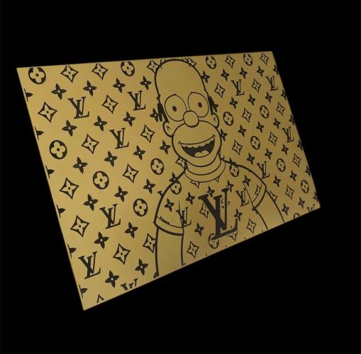 Pi-XL - Louis Vuiton - 'Homer' - Gravure op metaalplaat - Afm. 30 x 20 cm. x 2 mm. - Waardebepaling expert : € 1395 - Genummerde oplage 17/20 - Exclusieve 'Homer LV' Gravure op Goudkleurige Metaalplaat. Bent u op zoek naar een uniek statement piece dat cultstatus en luxe combineert? Bied dan mee op deze opvallende gravure van Homer Simpson in een designer-jasje. Dit kunstwerk is een speelse en gedurfde knipoog naar de 'hypebeast'-cultuur en modern design. Iconische Clash van Cultuur: De ultieme culturele mash-up. Het tijdloze monogrampatroon van 'Louis Vuitton' ontmoet 's werelds beroemdste vader: Homer Simpson. Dit zorgt voor een gewaagde contrast dat gegarandeerd gespreksstof oplevert. Geleverd met COA.
