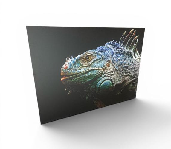 Afm. : 140 x 100 cm. - COBRA ART - Met COA - Geprint op een aluminium plaat - Prachtige, moderne wanddecoratie met een indrukwekkende close-up van een kleurrijke leguaan. Dit kunstwerk valt direct op door zijn levendige tinten blauw, groen en subtiele aardekleuren, gecombineerd met een donkere achtergrond die het dier extra diepte en karakter geeft. De fijne details van de schubben en de intense blik zorgen voor een realistisch en bijna tastbaar effect. De kader heeft een strakke, hedendaagse uitstraling en past perfect in zowel een modern interieur als een meer eclectische ruimte. Cobra Art Company, opgericht in 1983 als familiebedrijf, is een van de toonaangevende internationale groothandels en distributeurs van plexiglas foto's, schilderijen, meesterwerken, sculpturen en objecten. - De klanten wereldwijd bestaan uit retailers, architecten, ontwerpers, hotels en projectontwikkelaars.