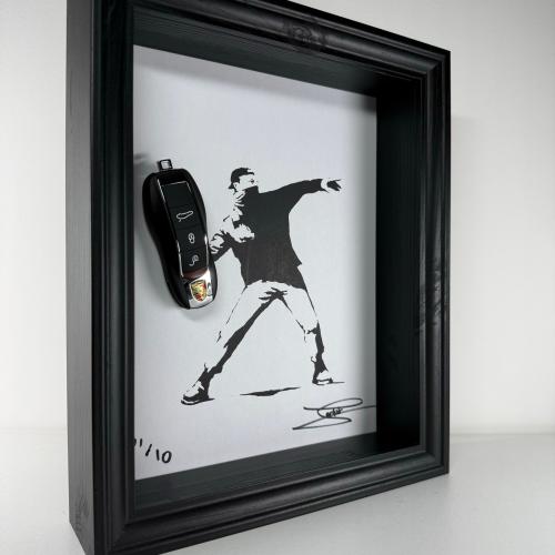 Waardering expert : € 300 - Met dit werk herinterpreteert Cartist het icoon van Banksy door er een Porsche-sleutel in te verwerken. De revolutionaire daad wordt hier een symbool van prestatie en exclusiviteit, waarmee de stedelijke verbeelding wordt verbonden met de automobiele mythologie van Duitsland. - Volledig met de hand vervaardigd in Frankrijk door Cartist, speelt het werk met het contrast tussen subversie en auto. - Jean Tourangin (Cartist) vernieuwt de hedendaagse kunst door erfgoed uit de schilderkunst te combineren met mythes uit de automobielwereld. Zijn exclusieve werken belichamen een zeldzame en gewilde esthetiek. - Werk geleverd met lijst en hoogwaardig synthetisch glas - afm. 28 x 23 x 6 cm. - Beperkte en genummerde oplage - Met certificaat, COA en handgesigneerd.