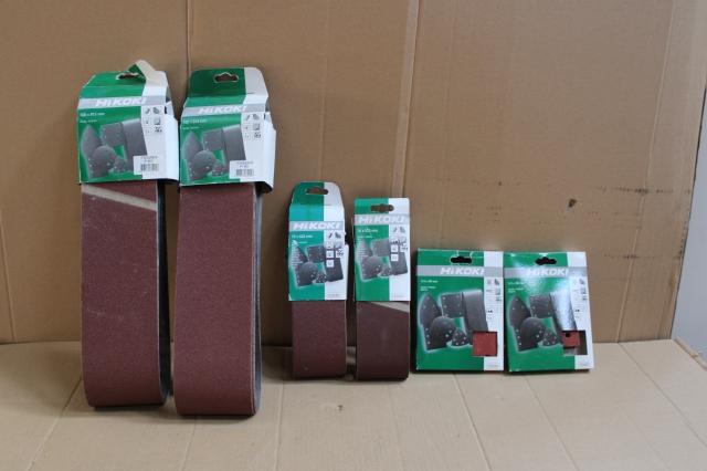 Plm 6 stuks, Partij Hikoki schuurpapier, 2 x SCHUURPAPIER SET 114X104MM K60,80,120 (15 ST), SCHUURBAND SET 76X533MM K60,80,120 (6 ST), SCHUURBAND 76X533 K100 (5 ST)(OUD 750857), 2 x SCHUURBAND 100X915 K80 (5 ST)