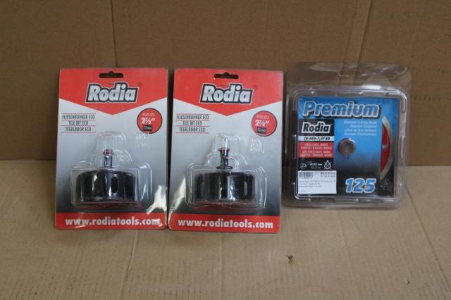 Plm 3 stuks, Partij Rodia Tools, 2 x Rodia Tegelboor Eco 73mm + 1 x RodiaTop® CR-RED-7.5T-extra dun Ø 125 mm - asgat 22.23 - diamanthoogte 7.5 mm