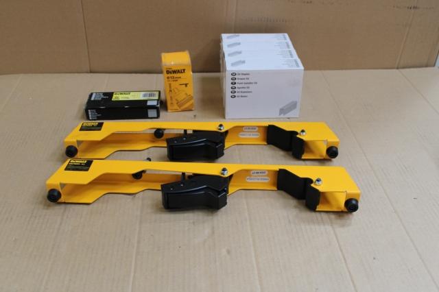 Plm 8 stuks, Partij Dewalt tools, 1 x DE7025-XJ Montagebeugels (DE7023) + 4 x DSTSX30Z [DSTSX] Nieten 5.6-30 Gegalvaniseerd 5m + 1 x DNBT1820SZ [DNBT18] Brads 1.25-20 Inox/RVS 5m + 1 x DT7005-QZ Boorkop 1,5mm-13mm L/R 1/2"x20UNF met SDS-Plus adapter