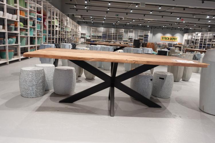 oude teak, vv: metalen spiderpoot, 2200x1000x800