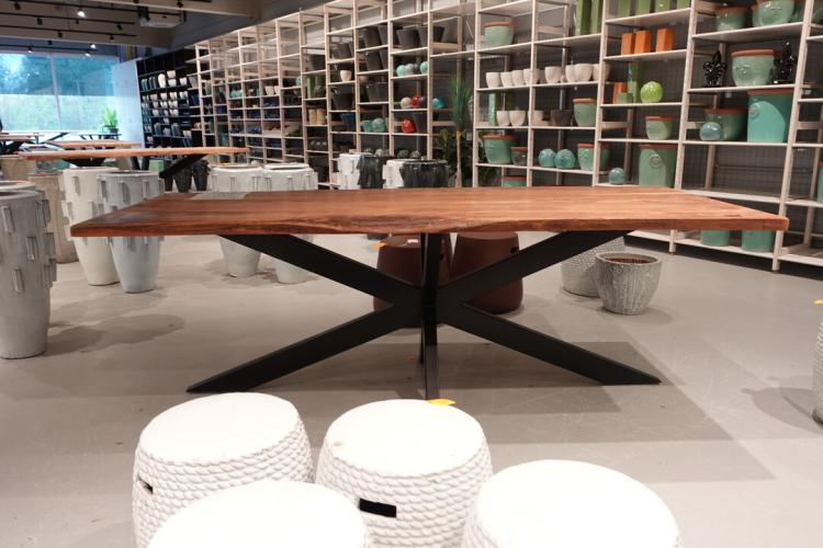 oude teak, vv: metalen spiderpoot, 2300x1000x800