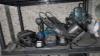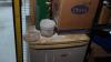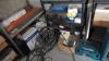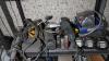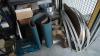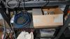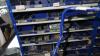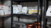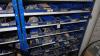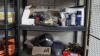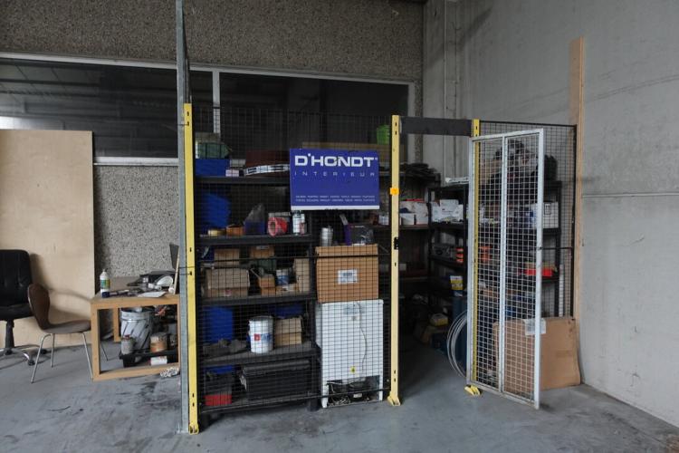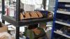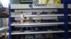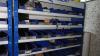oa. toebehoren lassen, 2x magazijnrek Fabory met diverse ijzerwaren, 2x koelkast, 4x kunststof rek, schuurblaadjes, ...