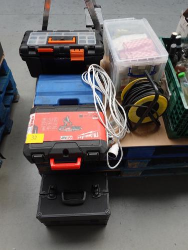 oa alu trapladder vv 4 treden, accuboormachine Milwaukee, 2x verlengkabel op haspel, 3x diverse koffer vv werkmateriaal