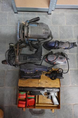 Frees, 3x schuurmachine, dremel, boorhamer kruitschiethamer
