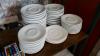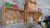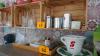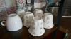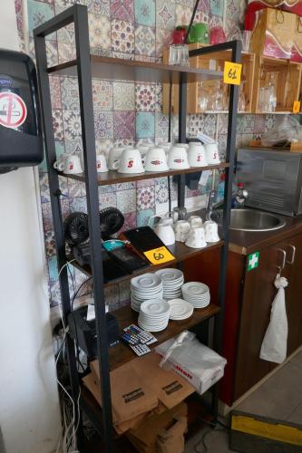 Opbergrekje met koffiekopjes en verpakkingsmateriaal ( toestellen zijn niet bij dit lot ) + kistrekjes met glazen en dergelijken